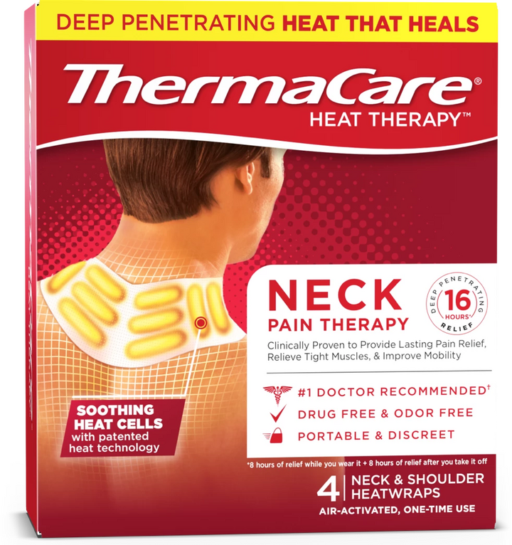 ThermaCare 颈部和肩部热敷带采用先进的设计,可适应您的动作,提供真正的持续热量。