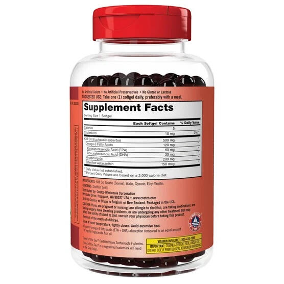 磷虾油(Euphausia superba)(500毫克)、胆固醇(10毫克)、Omega-3脂肪酸(120毫克)、二十碳五烯酸(EPA)(60毫克)、二十二碳六烯酸(DHA)(30毫克)、磷脂(200毫克)、酯化虾青素(150微克)